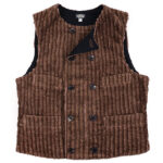 極太のジャンボ・コーデュロイを使用して製作された1900年代のダブル・フロント・ベストです。生地の質感とリアルホーンボタンが織りなす表情が、たまらなくかっこいいんです!