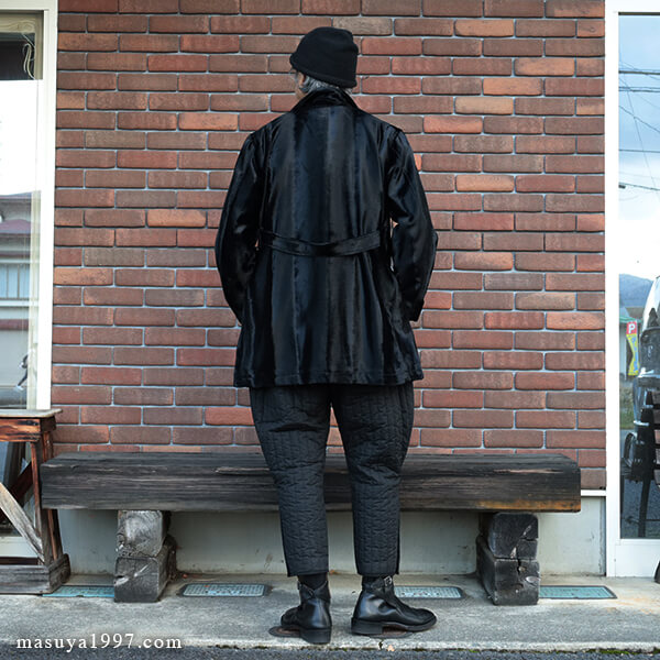 綺麗なAライン・シルエットとやや長めの着丈が特徴的なデザイン。そして、光沢とドレープ感のある漆黒の毛並み。シンプルながら大きく開いた襟や調節不可のウエストバンドが付くバックビューも印象的です。無駄のない洗練られたデザインとエレガントかつワイルドな表情が融合し、独特の色気が漂います。