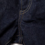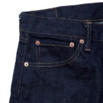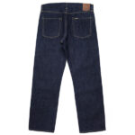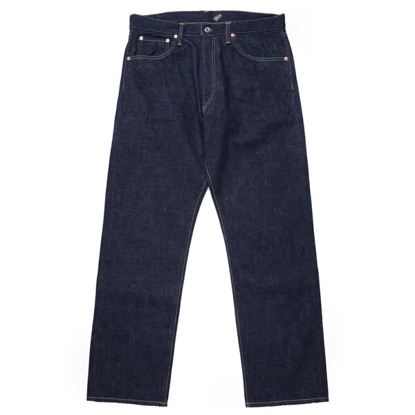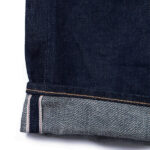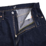 14ozのインディゴ・セルビッチデニムで、デニムの産地である岡山県で織った生地です。このデニムは、米綿主体の混綿を使用し、ナチュラルなムラ形状の糸を引いています。製織時に、経糸のテンションを緩めて織り上げることで、生地表面に凹凸が生まれ、穿き込んでいった後の経年変化でビンテージデニム特有の点落ちが生まれます。旧力織機を使い弱テンションでゆっくりと織り上げることで、50年代当時の雰囲気を再現しています。打ち込み過ぎず弱テンションで織られているため、穿き込んでいくと生地が柔らかくなり綺麗に縦落ちが出てきます。