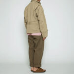 このジャケットは、1940年代のUS NAVYのライトゾーン・フライトジャケットM-421をベースに、CORONAの春アウターとしてデザインし直したものです。立てることもできる小さめのショールカラーが特徴で、短い着丈、太くカーブした袖や背中のアクションプリーツなど、全てが航空機内用にデザインされたものを活かし、今のスタイルへアップデートさせています。