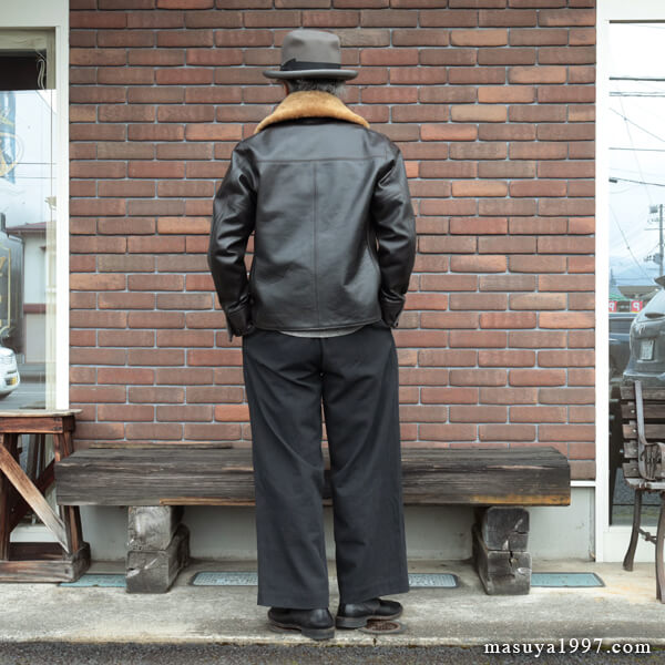 1920〜30年代のシングルブレストショールカラーコートをベースに製作された、ホースハイド・ハーフコートです。とても希少なショート丈を再現した今作は、前身頃にハンドウォーマーポケットやフラップ付き腰ポケットが付くタイプで、着丈とポケット配置のバランスが印象的な1着。5ポケットデニムはもちろんのこと、ワークパンツやトラウザーとも相性が良く、クラシカルな雰囲気を存分に楽しめます。