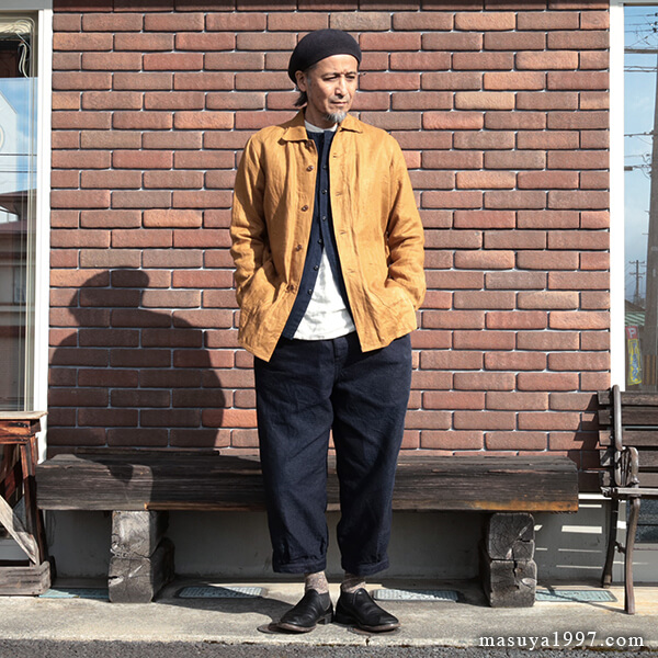 2作目となる今回は、サフィラン社のへヴィリネンを使って仕上げています。軽めの上着として使用するのに申し分のないオンスの生地で、上品にも、軽いワークジャケットのような感覚でも着用できます。