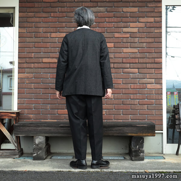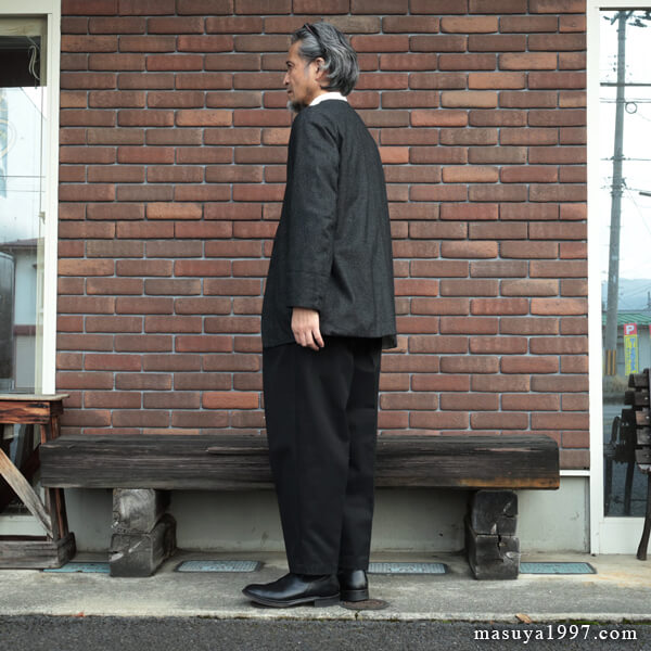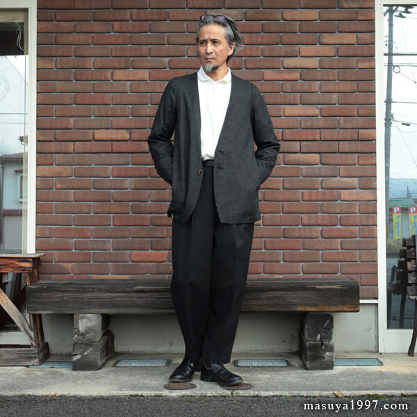 緩やかに伸び動きやすいテーラードな袖、拘りのサイドポケットなど、そのどれもが程よい大人のリラックスを演出しているかのような佇まい。着てみると、ほんとびっくりするくらいかっこいいです。さらに、共生地で仕上げた ヴェスト とのアンサンブルも、しびれるほどカッコイイ! エッセンスオブジャンゴなコーディネートを、ぜひ お楽しみ下さい!!