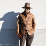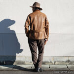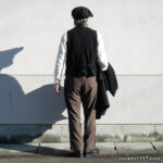 なお、パターンは前作と変更はありません。このパンツのウエスト周りは、サスペンダーを使用した際のシルエット・バランスを熟慮し、あえて大きめに設定されています。ウエストをベルトでギュッと絞って穿いた際の雰囲気も格別。尾錠にて微調節も可能です。なお、フロントは膝まで裏地付きの仕様です。