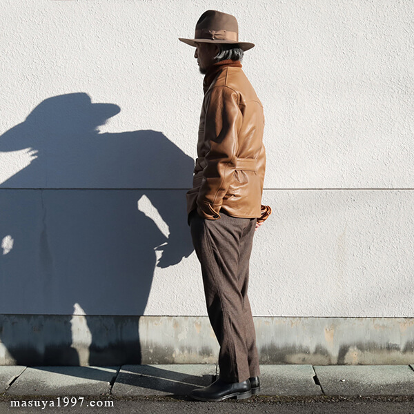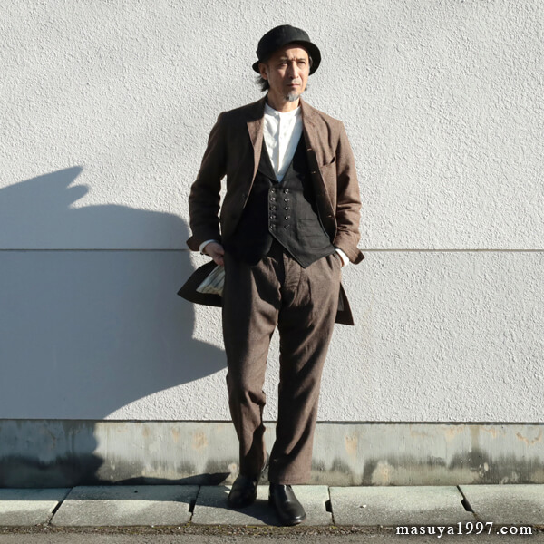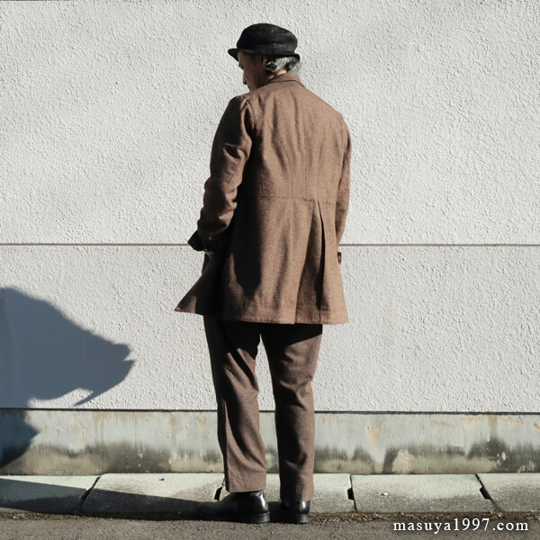 なお、パターンは前作と変更はありません。このパンツのウエスト周りは、サスペンダーを使用した際のシルエット・バランスを熟慮し、あえて大きめに設定されています。ウエストをベルトでギュッと絞って穿いた際の雰囲気も格別。尾錠にて微調節も可能です。なお、フロントは膝まで裏地付きの仕様です。