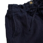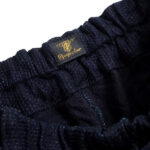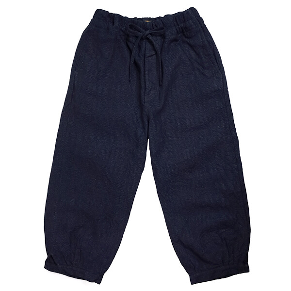今回は、やや厚手でしっかりとしたインディゴ染めの刺し子調のデニムを使って製作しました。インディゴの刺し子が濃淡織り交ぜながらフェードしていく風合いも魅力。はじめはややゴワ感がありますが、穿き込むことで次第に柔らかくなり、なんとも言えない表情豊かな色へと変わっていきます。初めてジャンゴのパンツを穿かれる方にもお勧めです。