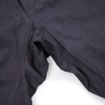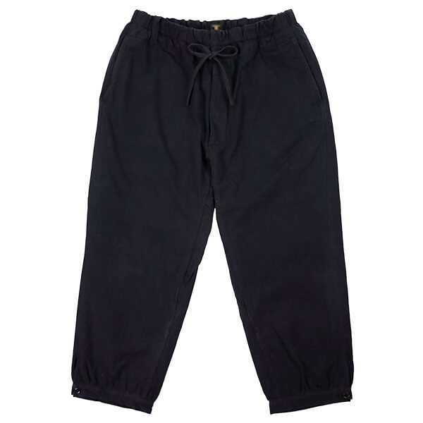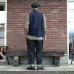 さらに、硫化染料によるムラ染めの色合いは、着用と洗いによってムラ感がジワジワと表れ、より一層雰囲気が増していきます。上品さも土臭さも感じるような、いにしえの庭師の姿を彷彿とさせる素晴らしい仕上がりです。 裾のボタンを外してスリットを開け穿いてもいいですよ!
