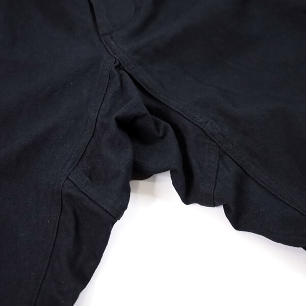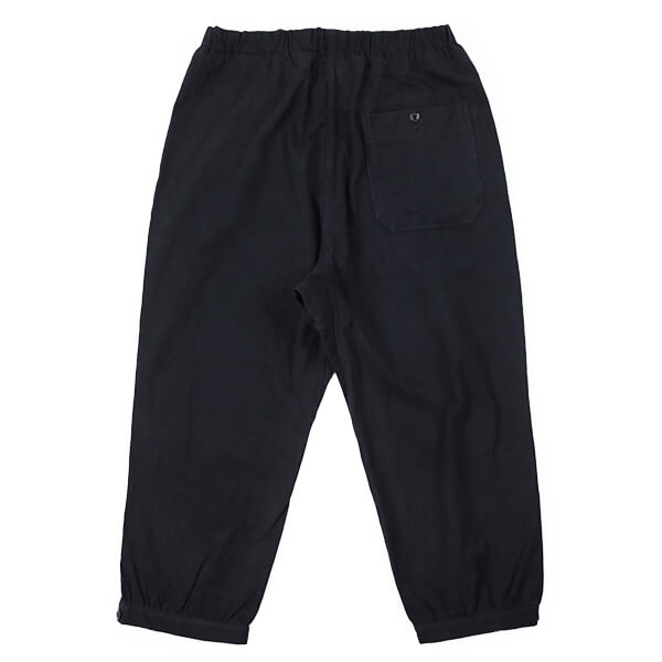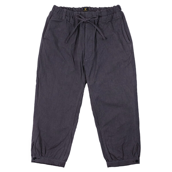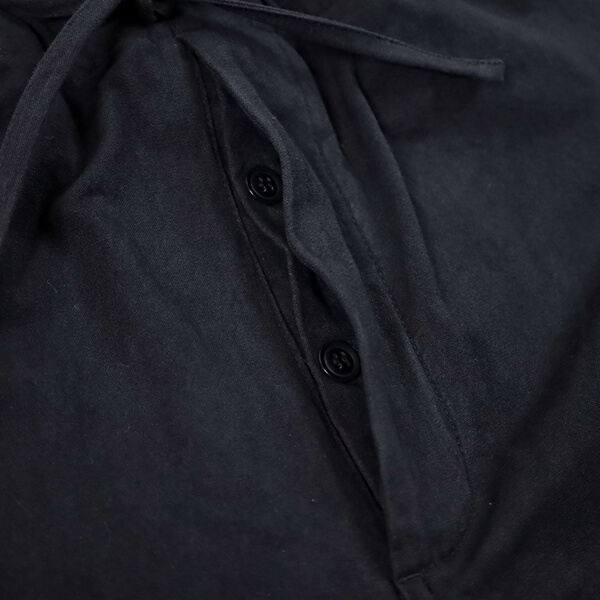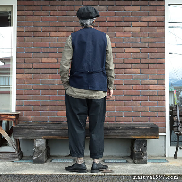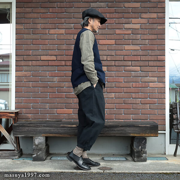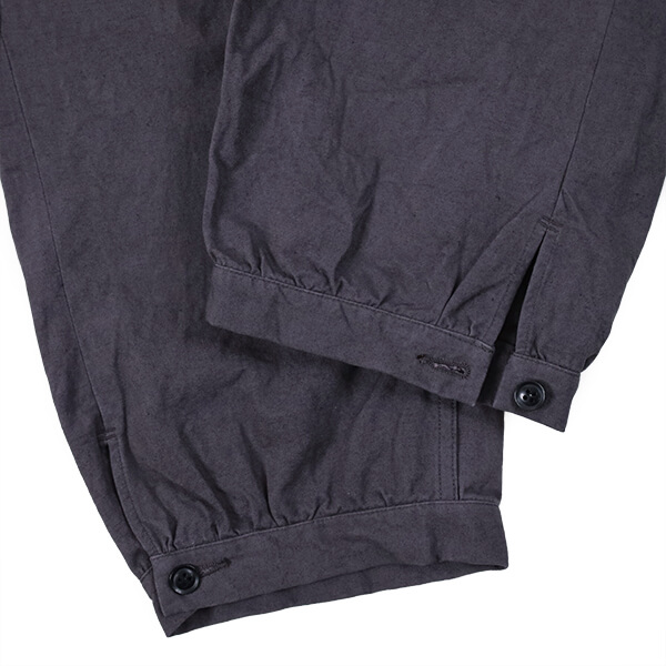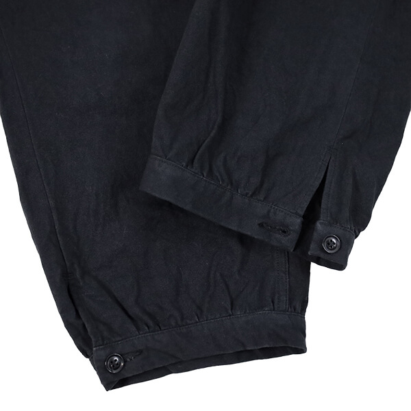 さらに、硫化染料によるムラ染めの色合いは、着用と洗いによってムラ感がジワジワと表れ、より一層雰囲気が増していきます。上品さも土臭さも感じるような、いにしえの庭師の姿を彷彿とさせる素晴らしい仕上がりです。 裾のボタンを外してスリットを開け穿いてもいいですよ!