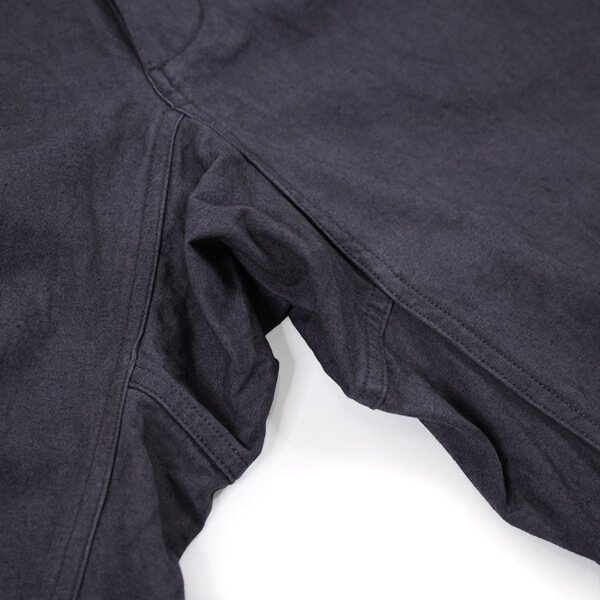 生地は、天然染料を職人技で染め上げたコットンリネンを使用。一年を通して穿いていただける程よい厚さの生地で、リネンが10%入っているので、風合いも良く、夏も着用できます。また、張りとコシのある生地感が、シルエットとも見事にマッチしています。
