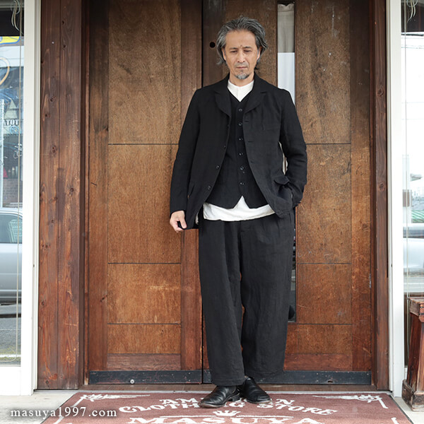 今回は、表地にベルギーリネンを使い、薄番手の黒のスレーキを張った総裏仕立てです。同素材のジャケットとパンツもご用意していますので、3ピースなどでもお楽しみいただけます!
