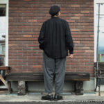 2013年製作の “postman smallcollar linen shirt” のデザインを、ゆったりとしたサイジングに改良し、新たにパターンメイク。12年ぶりのリリースですが、襟元(第1〜3ボタン)がループ式のスモールカラーは、やはり格別ですね。フロントの台襟両サイドにギャザーを取って立体感を出すなど、襟まわりの粋な表情がたまりません。