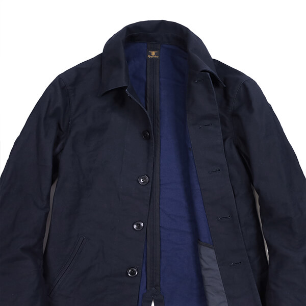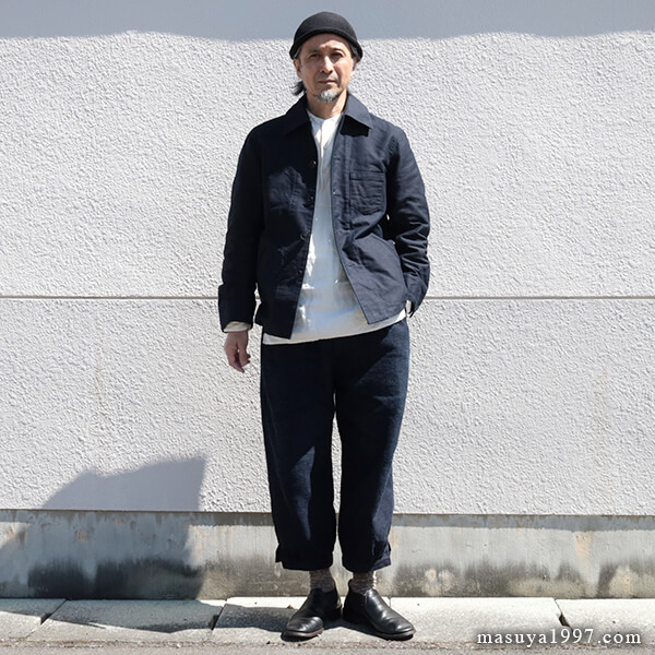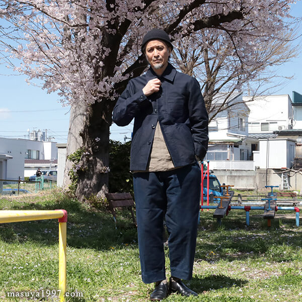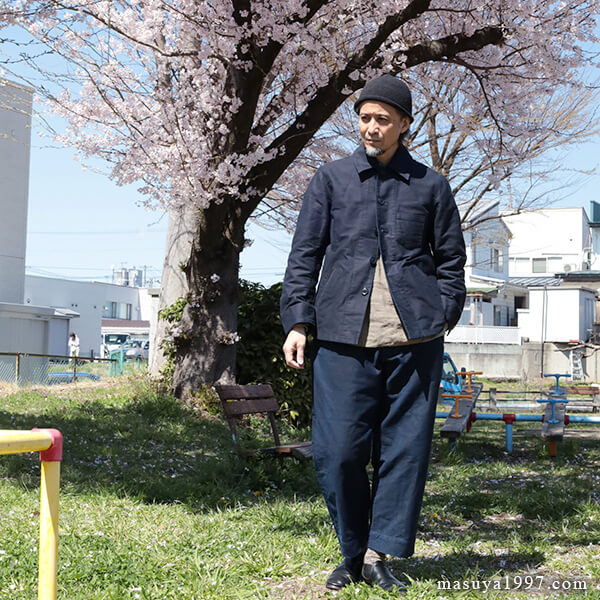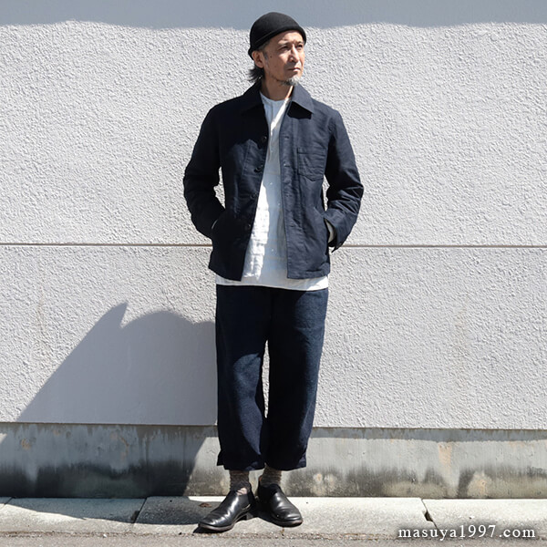 フランスのアンティークインディゴモールスキンのような生地感と、ワークジャケットでありながらどこか洗練されたデザインとの絶妙なバランスが、このジャケットの魅力です。