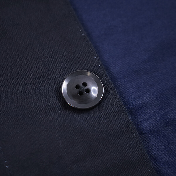 綿100%の厚手のモールスキンをインディゴ染めした後に、墨を主原料とする染料で表面だけを染めている大変手間をかけた生地です。はじめは少しハリのある質感ですが、着用・洗濯を繰り返すことで表面の墨染料が溶け込んでいくため、次第に柔らかくなっていきます。