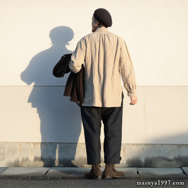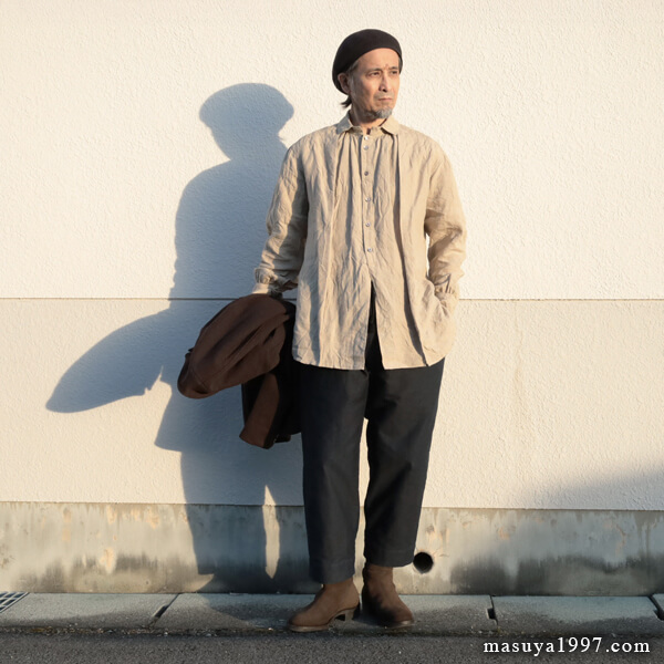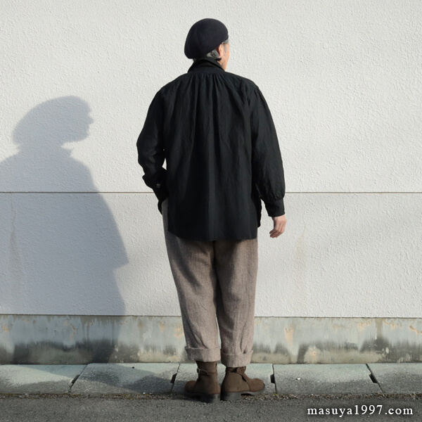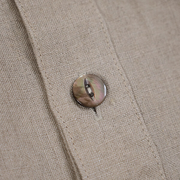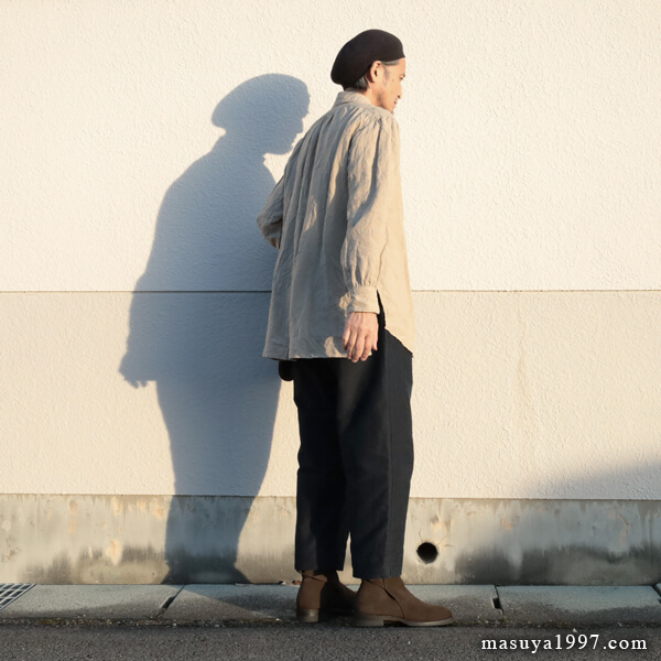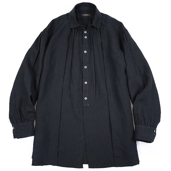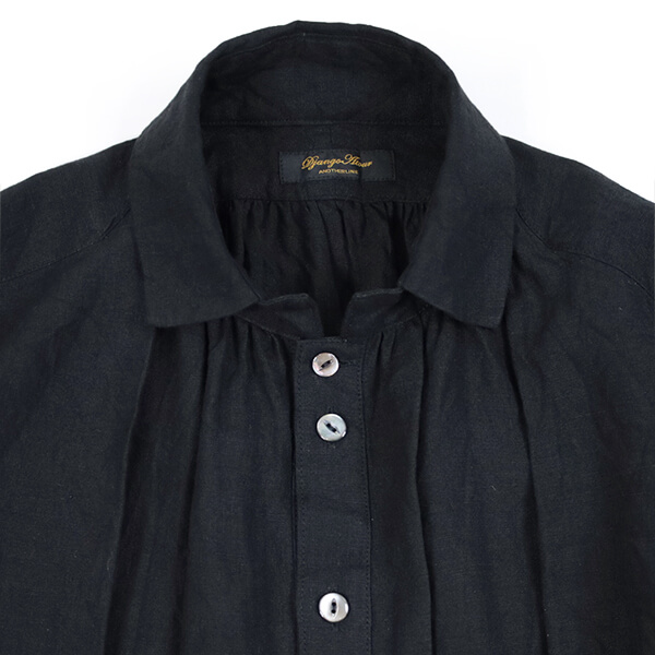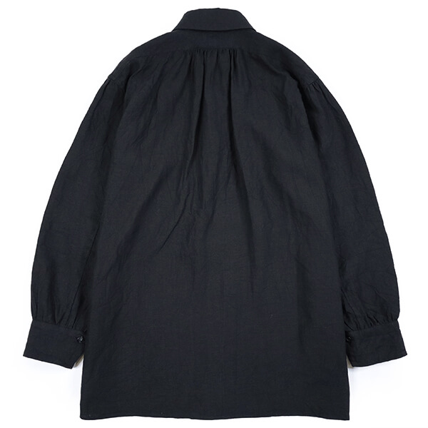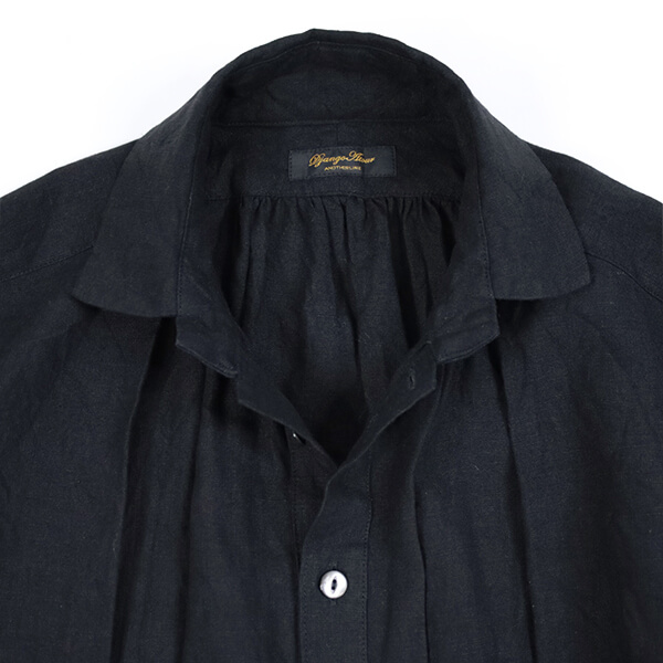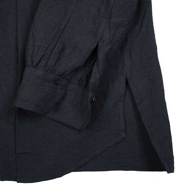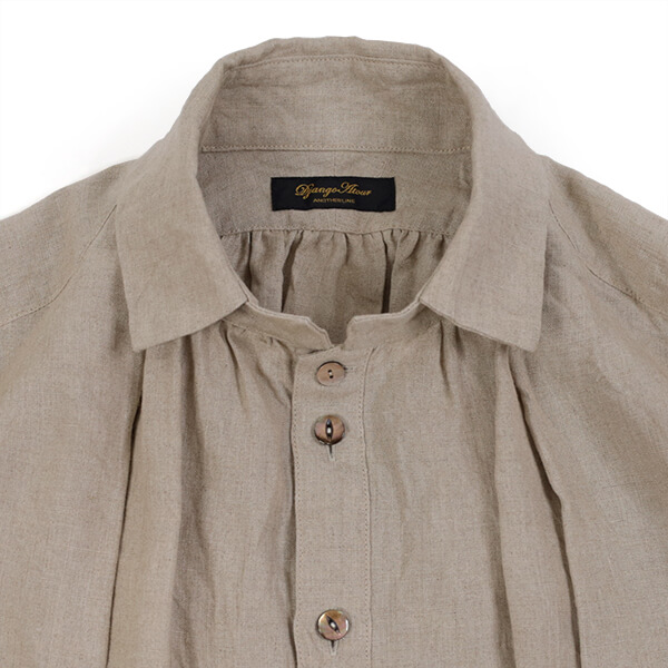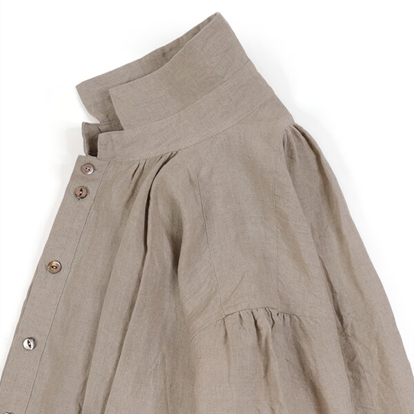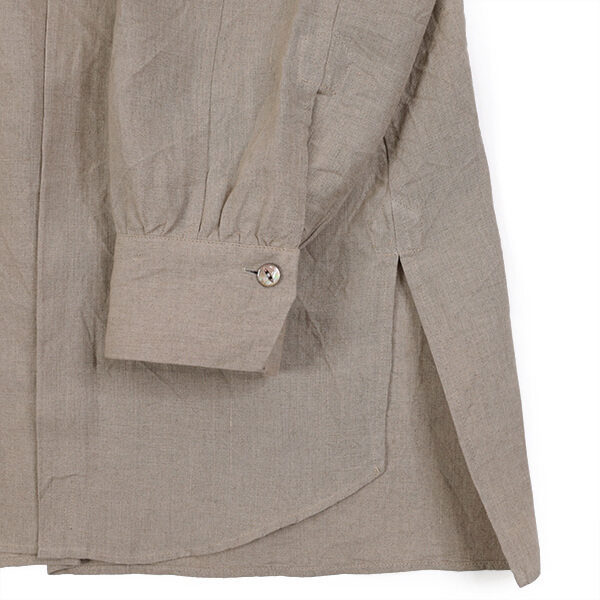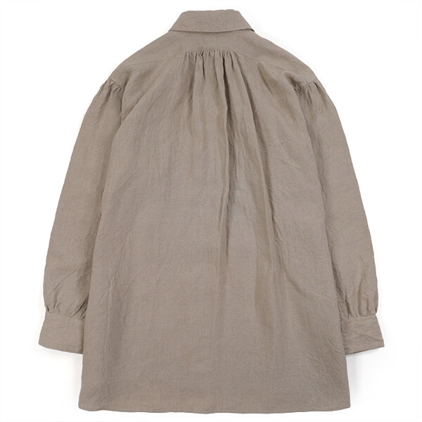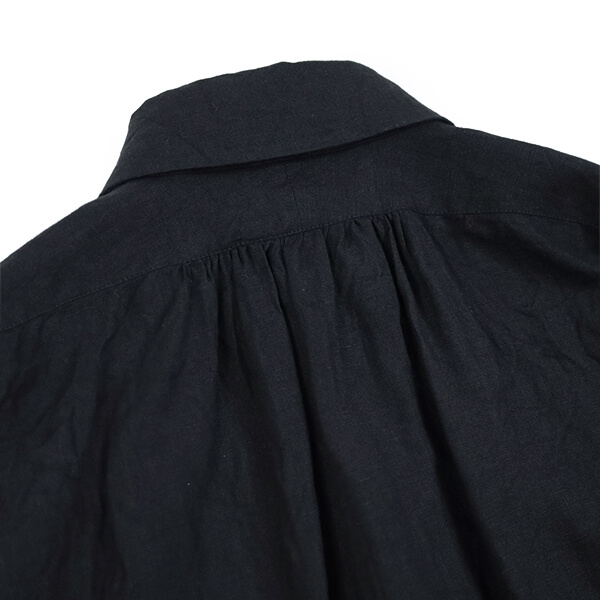 箇所箇所に施された細やかなギャザーをはじめ、襟、台襟、カフ、ヨークなどの「WORK+ANTIQUES=WORQUES」なディテールと、ベルギーリネンのドレープ感のあるシルエット。そして生地に包まれるような居心地のいい着心地。奥行きのある深く味わいのある色合いと、しなやかな質感にも魅了されます。秋・冬はコートのインナーに、春から夏にかけてはTシャツに軽く羽織ったりと、様々な着こなしが楽しめます。