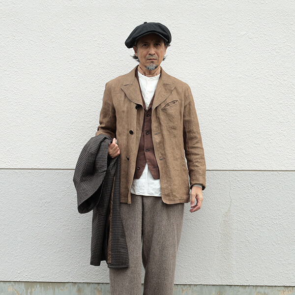「前作」から11年の熟成期間を経て2度目の製作となる今回は、稀有な染色法によりじっくりと丹念に染め上げたヘヴィリネンを使って製作しました。渋く上質なリネンが醸し出す雰囲気がたまりませんね。その佇まいは、まさにアナザーラインがイメージする「現代版アンティーク・クロージング」。単なる焼き直しではなく時代と対峙して作り上げた「かっこよさ」を感じる至高の1着です。
