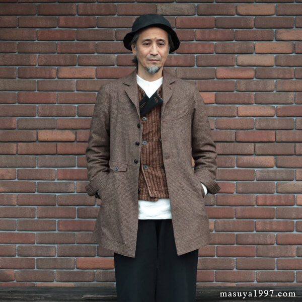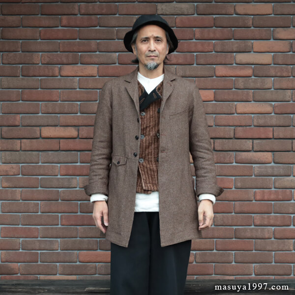 1800年代中期の労働着としてのフロックコートを “ヴィクトリアンズワーク” という視点で再構築した、アナザーラインならではの逸品です。今回は、以前製作した “victorians wool frockcoat” をベースに、スーツなどの上にも着用できるよう前回よりも少しゆとりのあるサイズ感にアップデートしています。また、表地にはやや薄手の軽くて暖かいガンクラブチェックのウールコットン・ツィードを使用。袖裏には滑らかで袖通りの良いキュプラを、身頃の裏地にはクラシックストライプの薄手の綿地を使い丁寧に仕立てています。コートとしても、ロングジャケットとしてもお使いいただけるミドルアウターです。