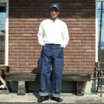 ※ 店主(173cm/60kg/w78cm)は「32」がちょうどいいサイズですが、あえてオーバーサイズで「34」を穿いてもいい感じです。。(着画では34を穿いています。)