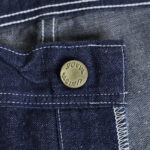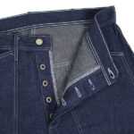 フロントのダブルニーに加え、ヒップ部分も一見構造が分かりにくいダブルヒップの二重構造仕様となっているのが特徴。また、3シリーズ初期型の特徴である角型ポケットや、初期型のみに見られる緑カンヌキ、当時と同じ鉄製の16.8mm “UNION MADE”ボタンなどを採用。当時、3シリーズとして存在していてもおかしくないディテールを備えた、「DURA-BILT」ネームによるインスパイアモデルです。