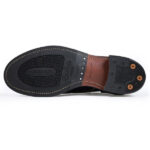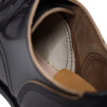 その素材感を活かすため裏革は使わず、ヘリンボーンツイルの当て布のみの一枚仕立てにしてあります。先芯を入れてないため、革が馴染むにつれトゥ部分が凹み、爪先まで皺やアタリを楽しめるのも特徴です。また、歩きやすさとバランスを整えるためにヒールは極力低くし、安定感のある履き心地を実現。また、雨の日や冬でも履けるように、ソールとヒールに「DR.SOLE」を採用しています。