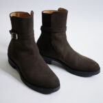 メイカーズ代表の手島氏のご協力のもと、店主が理想とするスタイルを形にしました。美しいフォルム、耐久性、履き心地、ホールド感、そして着脱のしやすさを追求し、一日中歩いても疲れにくく、さまざまなコーディネートに馴染むブーツに仕上げました。シャープな印象のシルエットに、絶妙な7インチハイトとストラップのバランス。そして、絶妙な色合いが魅力の「ブラウン・スエード」。この革ならではの落ち着いた雰囲気と佇まいも大きな魅力です。店主がどうしても履きたかった「スエードブーツ」を、今回リリースします!