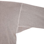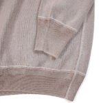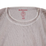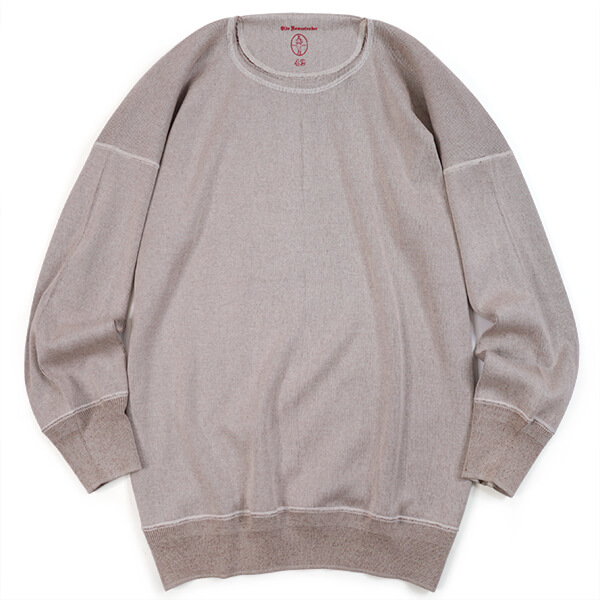 2023年シーズンから始まる新たなシリーズ ”INTERKNIT RIB”。 今回の編地は、糸を作るというアプローチではなく、同じ綿同士でも紡績の違う糸を組み合わせるというアプローチで製作。表糸にはいつものスーピマ綿の無染色の生成糸を、裏糸には “RUSTIC JERSEY” のスーピマ綿の落ち綿を糸染めして使用しています。裏糸(落ち綿)の自然なムラ感、膨らみ、吹き出し具合が編み地に対してうまく作用し、表糸の質感を際立たせた感じの独特の生地感になっています。 また、型の展開は “INTERLOCK” と同じですが、こちらは “Heavy Weight Rib” より度甘のリブ編みで、少し肉厚。 絶妙なハリと柔らかさがあり、フィット感はちょっとゆるめです。さらに、色合い(混色具合)も絶妙。着用による編地の伸縮具合によって独特の表情を見せてくれます。