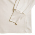 この “SILK RIB“ は、ウォッシャブル加工をシルクに施したシルクと、スーピマコットンを独自のレシピで掛け合わされた編み地(シルク50% × コットン50%)です。シルク特有のサラッとした肌当たりと、保温性を備えながらも蒸れにくい特性を活かし、汗をかいてもベタつかず快適な着心地に仕上げられています。コットンとシルク、それぞれの良さがあいまって、季節を問わず快適にお使いいただけます。