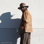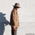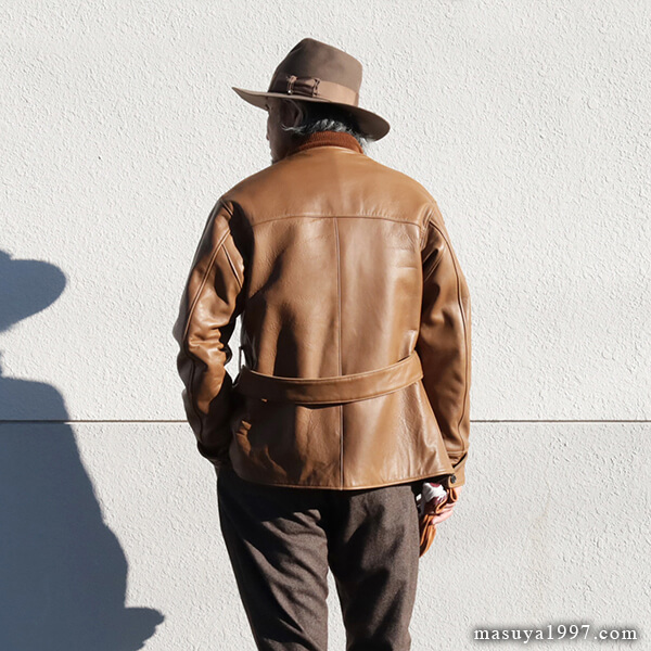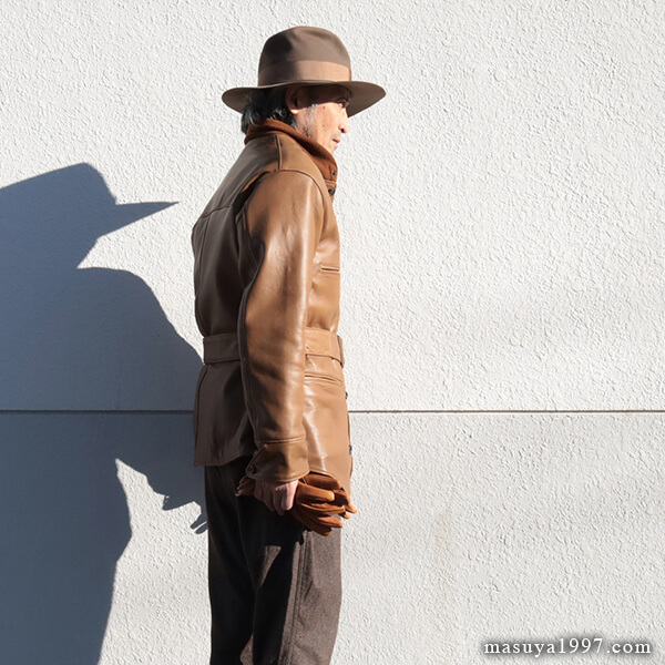 シングルブレスト、ウールラインド、4ポケットそしてウエストベルトでネックリブ仕様といった、まさに「ベストレザーコート」と呼ぶに相応しい完全無欠のコートです。1926年のメールオーダーカタログには、同じ名前で表記されていたため、躊躇うことなく戴冠しました。A-1ショートジャケットをコート丈にして使いやすくアレンジし、ベルトまで配したデザインは、当時のカタログを漁っても同じデザインはありません。フラップが付かない4ポケットはショートタイプのカーコートのイメージ。そしてネックリブに付くスナップボタンは1930年代、ボタン掛けスタジャンのごく初期にまでみられるディテールです。世界恐慌以前のレザ―コートは、アウトドア、ハンター、ワーカー、スポーツに大別されますが、こちらはその全ての中から必要な要素のみを取り入れたデザインが効いています。